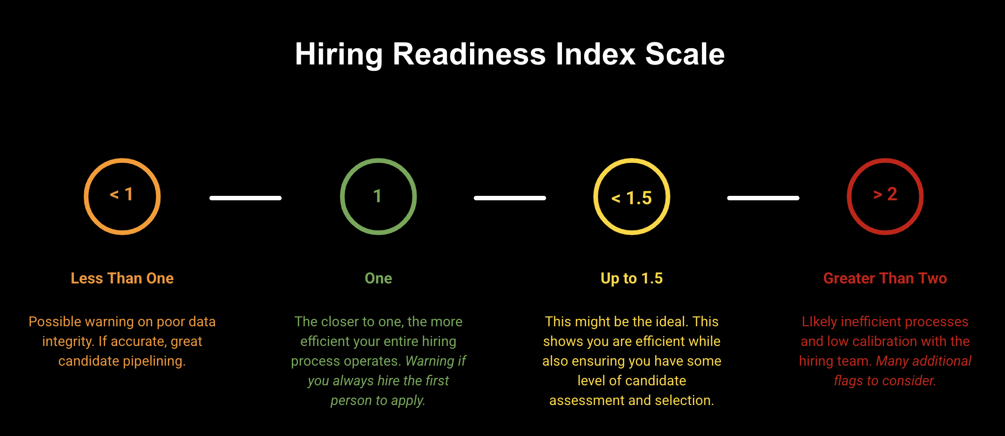 - HRI < 1 ⚠️ → An anomaly (or potential data issue), as a hire shouldn’t happen faster than the job is officially open. If a team is exceptional at pipelining talent ahead of the role being opened, this is possible, and should be highlighted as excellent. 🎉